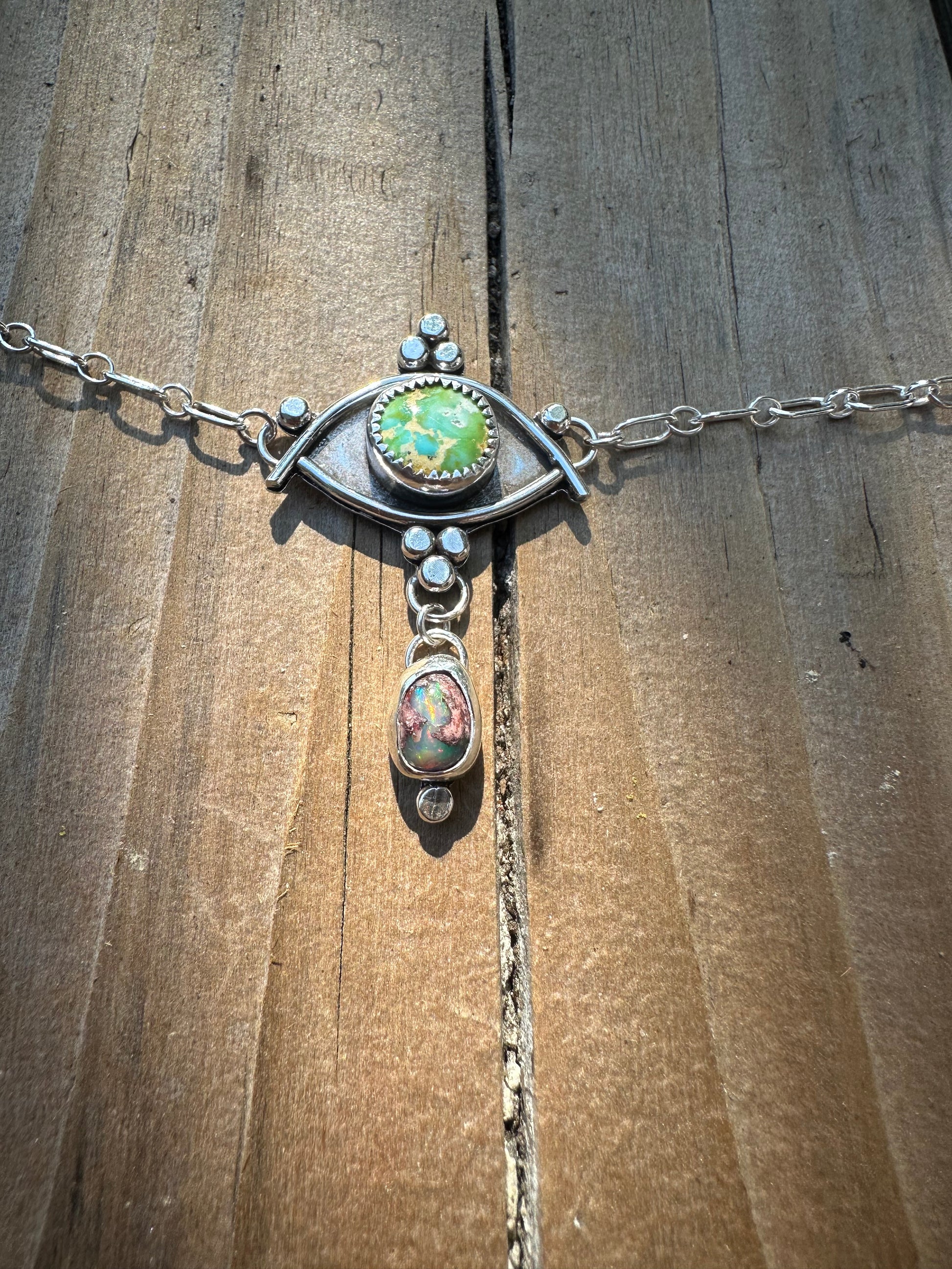 Green turquoise and fiery opal set in sterling silver. Welded jump rings and hook closure to last a lifetime. Total length is about 16”